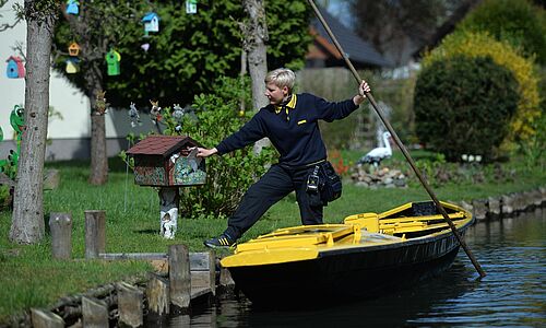 Andrea Bunar bringt nicht nur die Post, sie bietet gleichzeitig auch den Service einer kleinen Filiale an: Ihre Kunden können ihr Sendungen mitgeben sowie Brief-, Päckchen- und Paketmarken kaufen. Auf ihrer Tour durch Lehde leert sie auch drei Briefkästen, die an Ausflugslokalen angebracht sind.